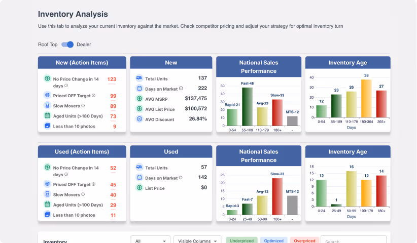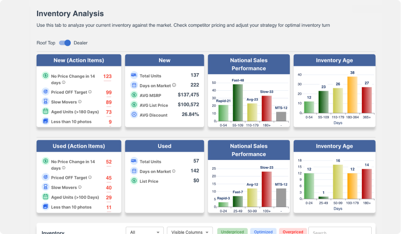 On this 30-minute RV inventory review, we’ll analyze your real units with our market-derived sales intelligence; identifying overpricing, underpricing, aging exposure, and pricing risk.